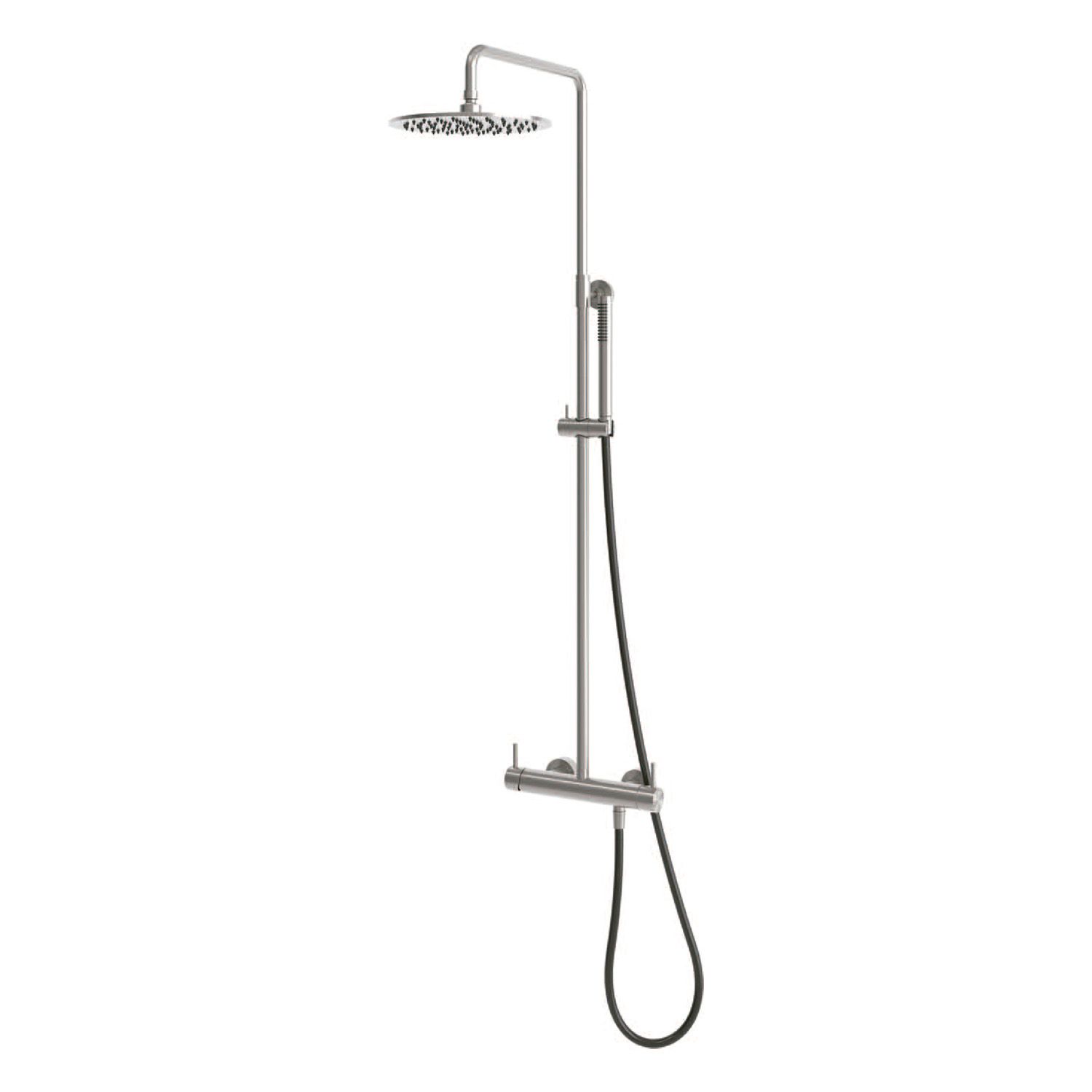 discover the perfect blend of style and durability with the sined nora outdoor shower, crafted from premium 316l stainless steel and finished with a sleek gun metal pvd coating. designed with a 25 cm showerhead and versatile double side or bottom water inlet, this shower stands out not only for its elegant design but also for its exceptional resistance to weather and wear, making it ideal for both private gardens and professional outdoor spaces.
