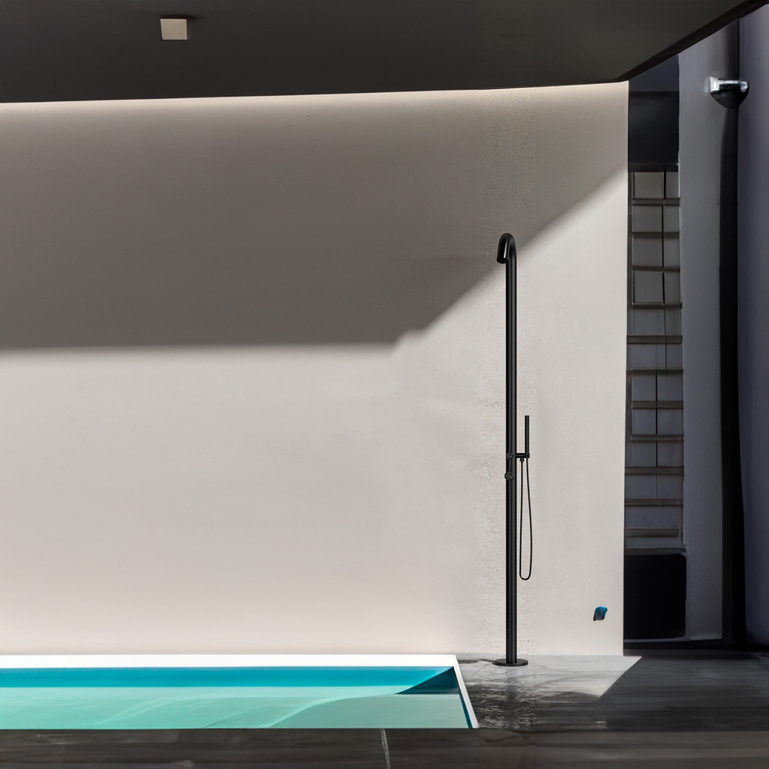 - 1-high quality black outdoor shower with 3-way mixer for overhead shower Hand shower and foot wash Concealed water connections on the base.